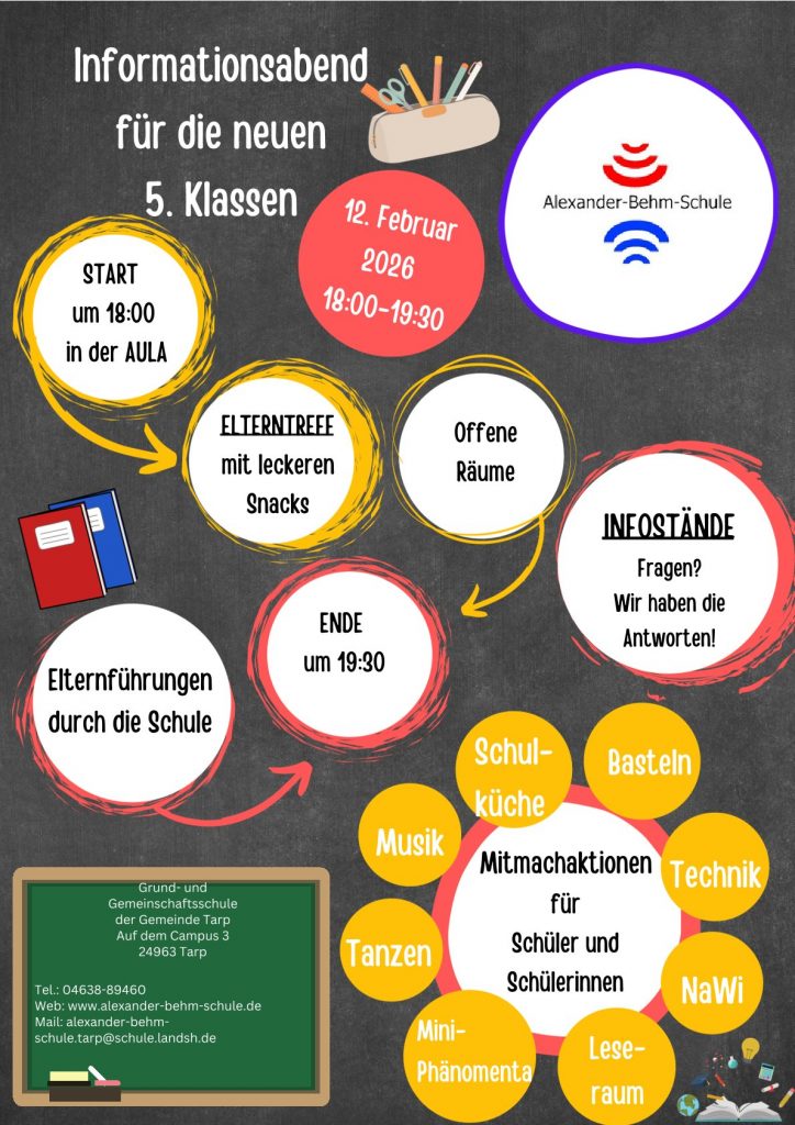 Am 12. Februar 2026 von 18:00 bis 19:30 Uhr lädt die Alexander-Behm-Schule alle interessierten Eltern, Schülerinnen und Schüler der zukünftigen 5. Klassen zum diesjährigen Infoabend ein. In einer entspannten Atmosphäre können Sie sich ein umfassendes Bild von unserer Schule und ihrem Angebot machen.